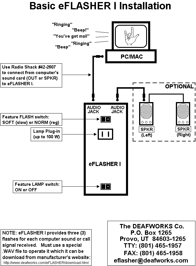 P.O.Box 1265 Provo, UT 84603-1265 USA VOICE RELAY: (800) 855-2881 UTAH VOICE RELAY: (888) 735-5906 TTY: (801) 465-1957 FAX: (801) 465-1958 Internet: www.deafworks.com E-mail: eflasher@deafworks.com Hours: 9:00AM-6:00PM (Mountain Time - MST) Monday through Friday |